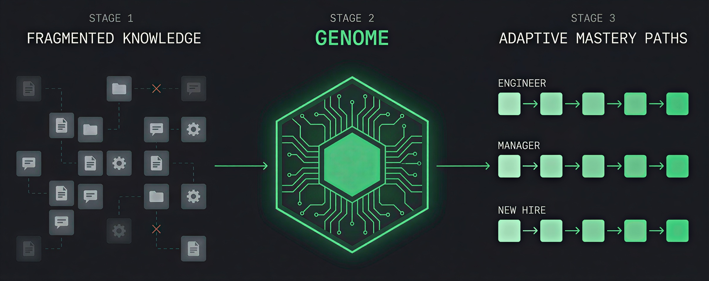 Most companies don't have a knowledge problem; they have a retrieval and retention problem. Genome acts as the foundational engine that ingests fragmented documents, internal tools, and tribal knowledge to bridge this gap. It structures the organization's "Knowledge DNA" into a unified source of truth. But while Genome creates the structure, Gradus makes it teachable. When a process changes at the source, Gradus automatically reshapes the learning experience, ensuring employees don't just "find" information—they master how the organization operates.