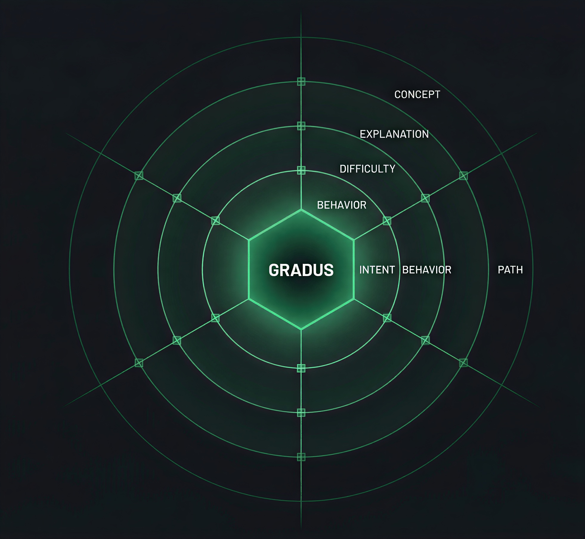 Gradus is a direct response to these structural failures. Our goal is to build a system where the learning experience evolves in real-time alongside the learner—not just at the surface level of recommending the next video, but across six interdependent layers that have remained static in every learning platform built before:
