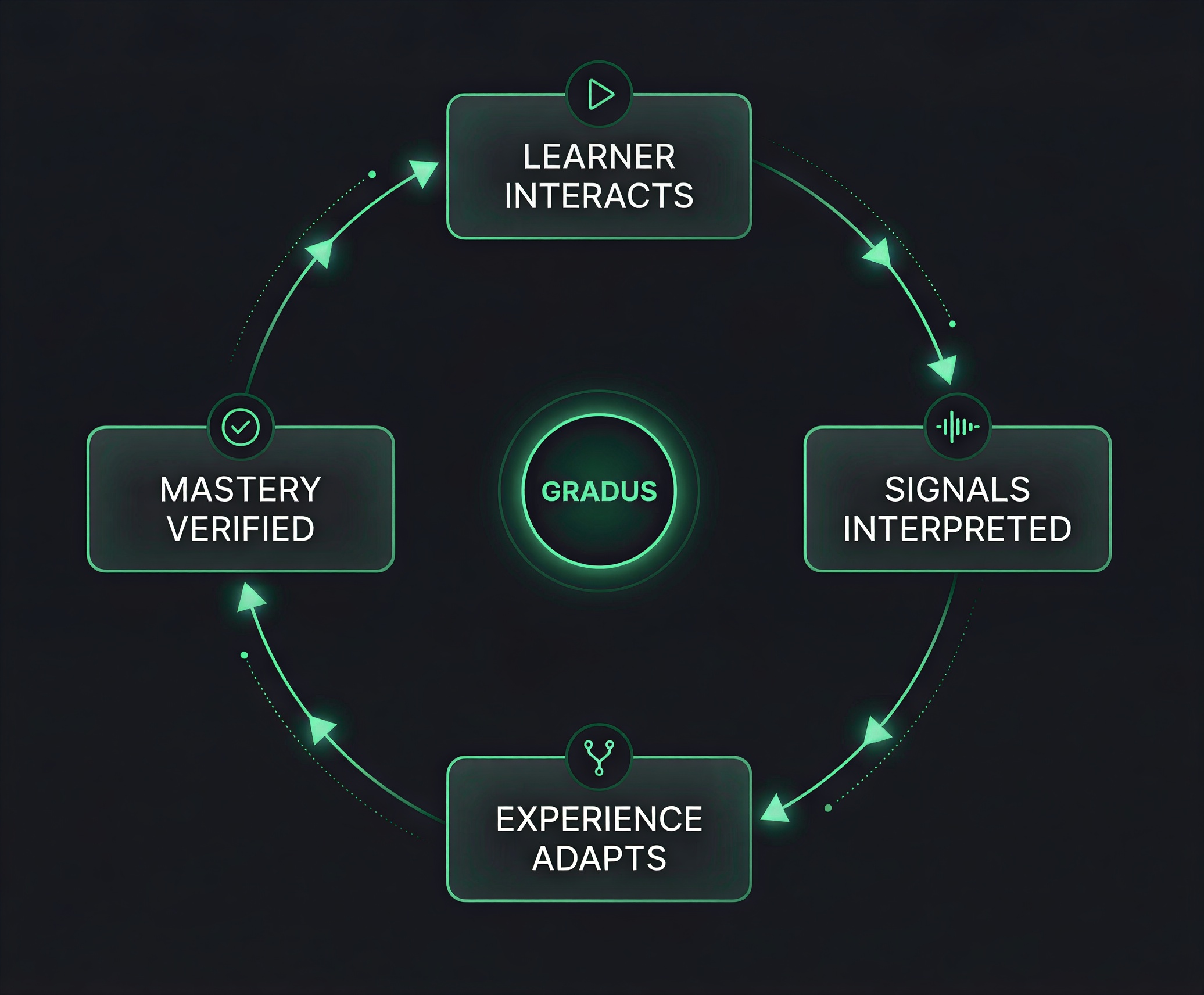 We view Gradus as a closed-loop system: you interact, the system interprets the signals, and the experience is adjusted in real-time. Unlike traditional systems where feedback comes at the end, Gradus adapts during the learning process.
