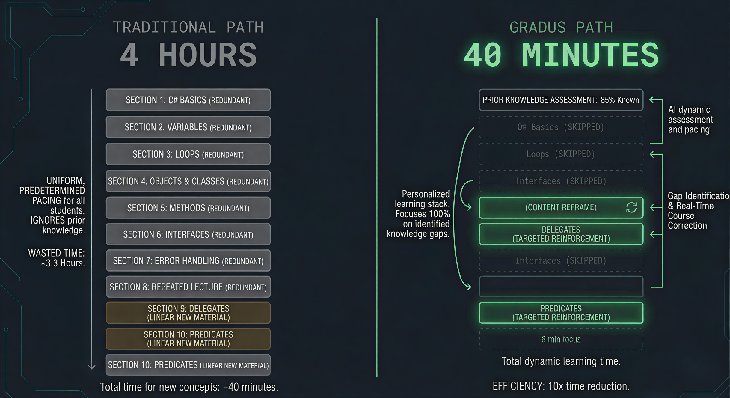 We've moved away from fixed, linear courses. In Gradus, a "course" is a living pathway that evolves based on what you understand and how your behavior changes. Two learners starting on the same topic may take completely different paths as the system dynamically slows down, accelerates, or reroutes to ensure mastery.