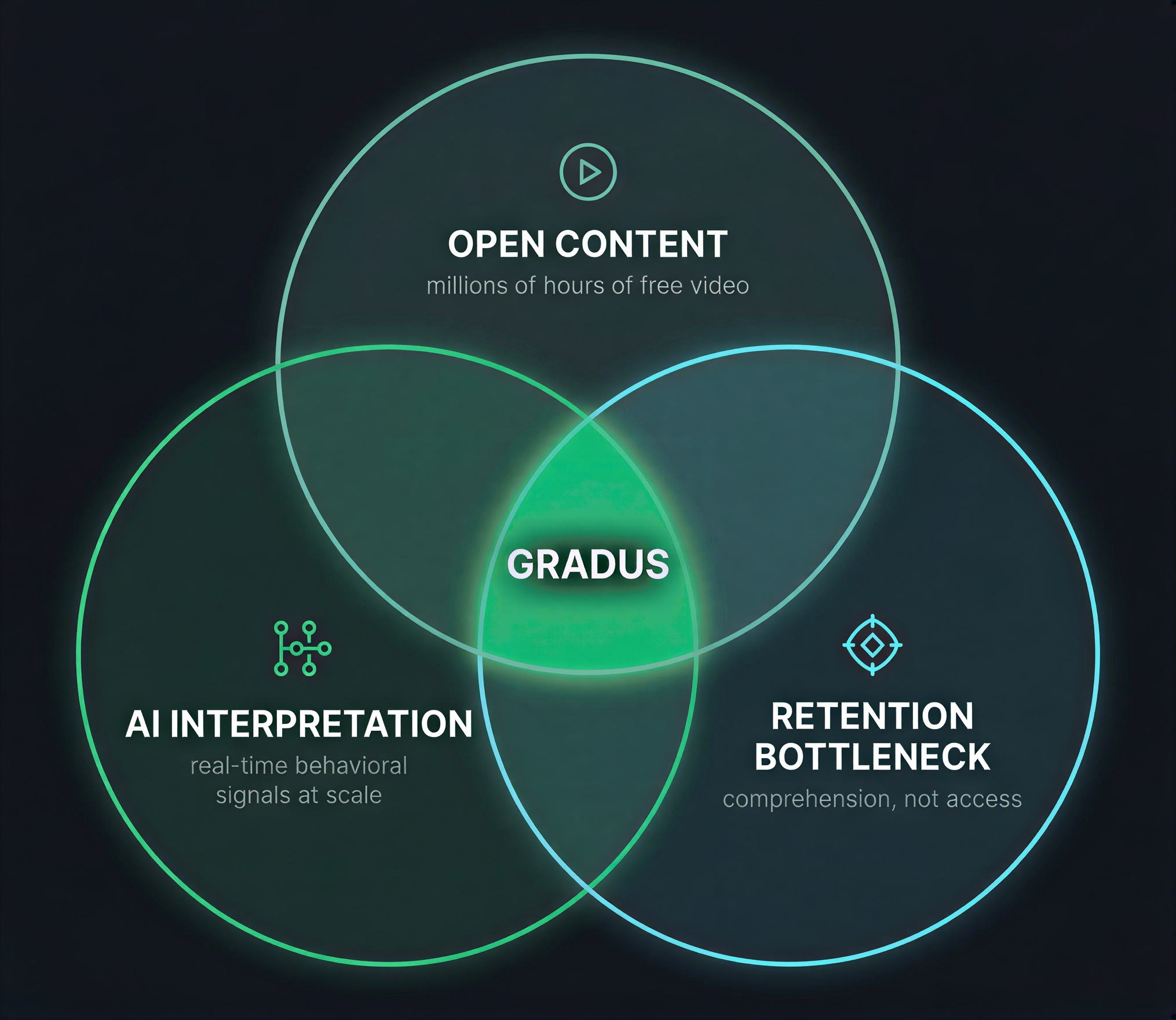 Three forces have converged to make this possible in a way that wasn't feasible a decade ago. First, the explosion of open educational content—millions of hours of high-quality video across every domain—has eliminated content scarcity as a bottleneck. Second, advances in AI now enable real-time interpretation of complex behavioral and conceptual signals at scale, something that previously required a human tutor in the room. Third, the bottleneck in learning has fundamentally shifted: the problem is no longer finding knowledge—it's making it stick. Gradus exists at the intersection of all three.